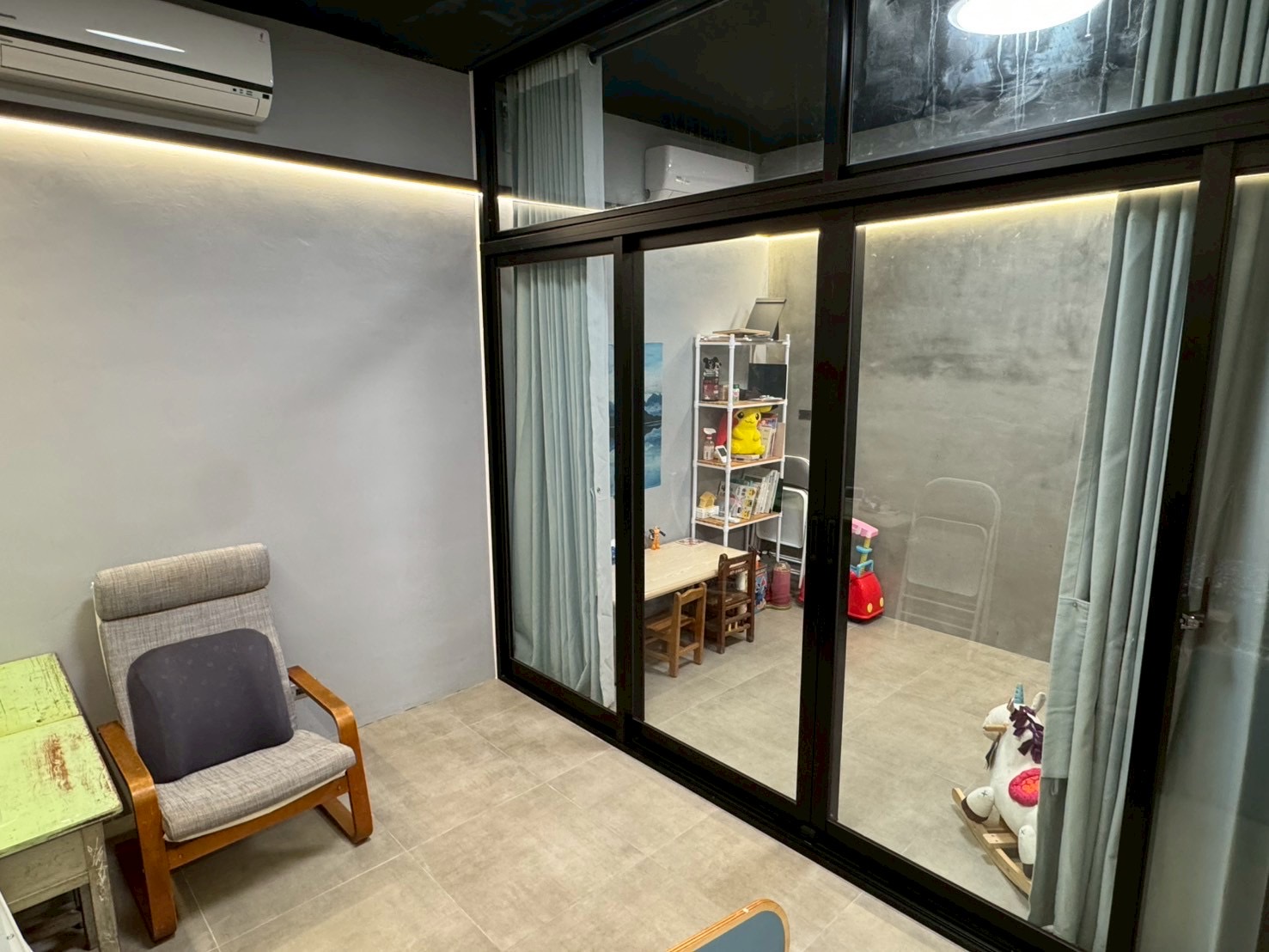 所內設有兩間主要教室,能依需求分區使用;若需更大範圍的活動空間,可透過開啟中間的落地窗,合併成為一間寬敞場域,以因應團體課程或特殊活動的需要。