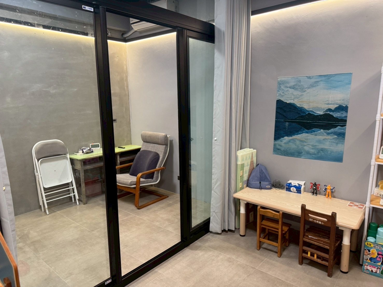 本心理治療所致力於提供安全、舒適且專業的治療環境。我們深知環境對於治療歷程的重要性,因此在空間規劃與細節設計上,皆以「支持兒童情緒穩定、促進治療效果」為核心理念。