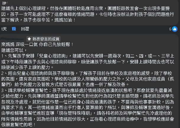 留言區裡常常可以看到其他家長鼓勵:「建議先上個別心理課。」